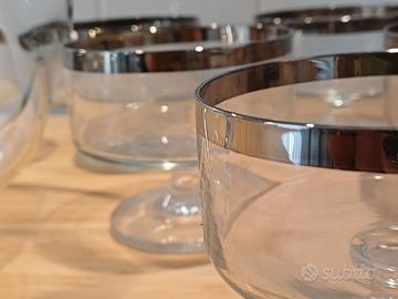 Vendesi raffinato servizio per macedonia con bordino argentato della metà XX secolo. Cristallo finemente lavorato. Una sottile striscia argentata sui bordi impreziosisce il servizio rendendolo elegante e ricercato. Il servizio è composto da 6 coppe dal diametro di 10 cm ed una grande coppa da 20 cm. Tutti i pezzi non presentano difetti o sbeccature. Il bordo argentato è perfettamente integro. In altro annuncio possibilità di integrare set di bicchieri in stile.