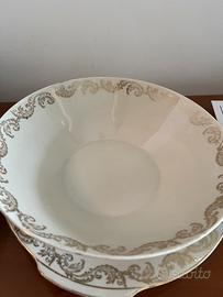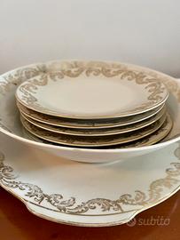 Raffinato servizio da tavola d’epoca, perfetto per gli amanti dello stile classico e senza tempo. Ogni pezzo è impreziosito da delicate bordature in oro zecchino e decorato con eleganti motivi floreali, che conferiscono un tocco di romanticismo e distinzione. Ideale per collezionisti, arredamento shabby chic o per dare un tocco di charme alla tua tavola in occasioni speciali.