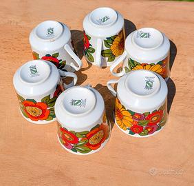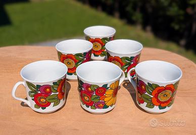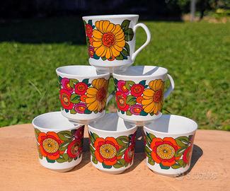 Le tazzine presentano una vivace decorazione floreale anni ’70, caratterizzata da colori brillanti e dettagli curati che donano un tocco retrò e raffinato alla tavola.