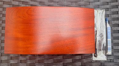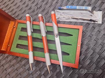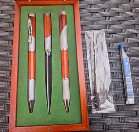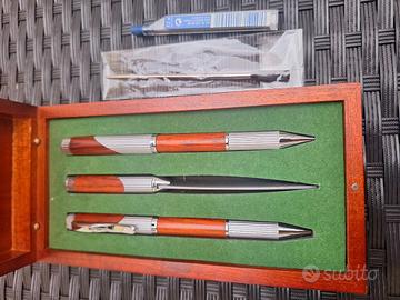 Elegante set da scrittura personalizzato in custodia-astuccio in legno - Penna a sfera con ricarica-refill nero - Matita portamina - Tagliacarte Materiale: legno color marrone scuro e metallo lavorato. In dotazione: - 1 ricarica-refill nero - 1 confezione mine Staedtler Luogo di ritiro: - Porlezza (CO) - Grassobbio (BG) - Vigonovo (VE) - Mirano (VE) Oppure spedizione a carico dell'acquirente. Vendo inutilizzo.