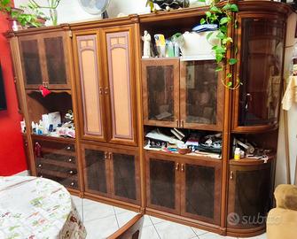 Questo soggiorno di si distingue per il suo stile tradizionale ed elegante, caratterizzato da una maestosa parete attrezzata in legno massello con finiture calde e venature naturali, con un'altezza di H.210cm Lungo 257cmq e profondo 55cm è un arredo realizzato con materiali di qualità, unisce funzionalità e gusto classico, offrendo ampie vetrine, vani contenitori e ripiani curvi ideali per esporre cristalleria, libri o oggetti decorativi.
