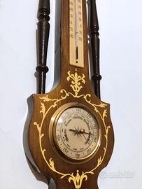 In vendita una raffinata stazione meteorologica d'epoca in legno intarsiato e finiture in ottone. Realizzata in legno di noce con splendidi intarsi dorati a motivi floreali. Il design a colonna è arricchito da due eleganti colonne laterali scure. Multifunzione: In Alto un igrometro circolare con scritte in italiano ("SECCO", "NORMALE", "UMIDO"). Al Centro un termometro a mercurio con scala in Gradi Celsius (°C). In Basso un secondo barometro circolare con scala della pressione atmosferica (720-770 mmHg) e indicazioni meteorologiche (Variabile, Pioggia, Bel Tempo). Sotto il Barometro un orologio da parete con quadrante a numeri romani e movimento decorato. Ottime condizioni estetiche, come visibile dalle foto. Non è stato testato il perfetto funzionamento degli strumenti. Dimensioni: Altezza: 84 cm Larghezza Massima: 22 cm Ritiro a mano a Roma, zona Cipro