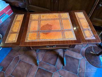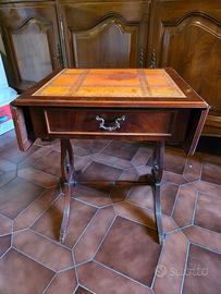 Elegante tavolino in stile classico. In noce con piano in pelle vintage. Il cassetto frontale e le alette design a foglie cadenti, che permettono di estendere la superficie, consentono un versatile utilizzo anche come piccolo scrittoio retrò. I sostegni a forma di lira ne esaltano il fascino senza tempo. Presenta pelle rovinata (vedi foto). No perditempo. Solo amatori. Dimensioni: 45/70x37,5x52h