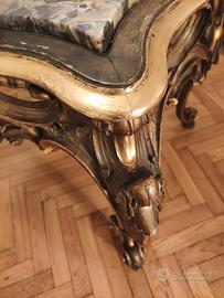 Elegante tavolo vintage in stile barocco veneziano, con struttura in legno intagliato e dorato, gambe scolpite e patina originale.