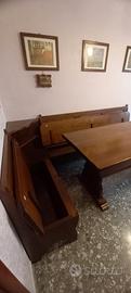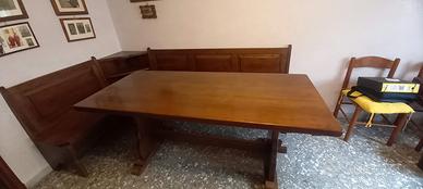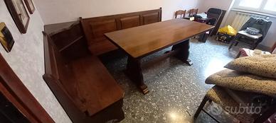 Vendo a malincuore splendido set da pranzo composto da tavolo e panca angolare, entrambi realizzati in pregiato legno di noce massiccio. Un pezzo d'arredamento unico che unisce l'autenticità dello stile tradizionale Il set è interamente realizzato in noce di alta qualità, noto per la sua bellezza, durevolezza e calda venatura. La panca presenta le caratteristiche doghe orizzontali e gli intagli decorativi tipici dello stile tradizionale, un capolavoro di artigianato. La panca offre un comfort eccezionale e spazio aggiuntivo nascosto sotto la seduta, perfetto per coperte o stoviglie. Il tavolo è robusto e stabile, perfetto per cene conviviali. Il set è stato conservato con cura e presenta pochissimi segni di usura, mantenendo intatta la sua bellezza originale.