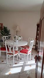Vendo raffinato tavolo rotondo in legno laccato bianco, completo di 6 sedie coordinate in stile classico. Il tavolo è caratterizzato da una solida base centrale lavorata con dettagli intagliati che ne esaltano l’eleganza e garantiscono stabilità.