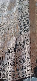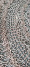 Vendesi magnifica tovaglia rotonda realizzata interamente a mano all'uncinetto con filato di cotone di qualità color avorio/ecru. Il design è caratterizzato da un raffinato motivo centrale a spirale (effetto girandola) che sfuma in una ricca balza lavorata con il classico e prezioso "punto pigna".