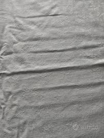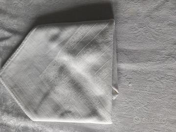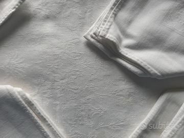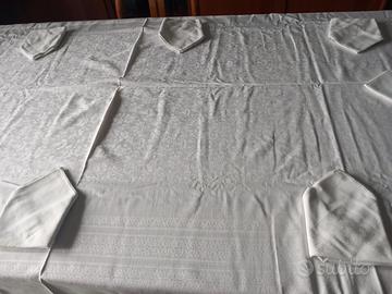 Elegante tovaglia rettangolare bianca con un raffinato disegno damascato e disegni geometrici tinta su tinta. Aggiunge un tocco di classe alla tavola. Provvista di 8 tovaglioli. Misure: tovaglia cm. 140 x 22; tovaglioli cm. 55 x 55. Faceva parte di un corredo ed era conservata nel baule della nonna. Il tessuto è solo un pochino ingiallito dal tempo qua e là, ma è integro.
