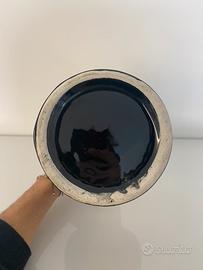 Vendesi raffinato vaso ornamentale in porcellana nera lucida, caratterizzato da un ricco decoro in stile orientale con pavoni e peonie, impreziosito da dettagli in oro zecchino (foglia oro). Un pezzo d'arredo di grande impatto visivo, perfetto per ambienti moderni, classici o eclettici che necessitano di un punto luce sofisticato. Caratteristiche principali: • Altezza: 33 cm (dimensione importante, ideale per mobili o ingressi). • Diametro bocca: 11 cm. • Colori: Fondo nero profondo, decori vividi e profili dorati estremamente luminosi. • Stato di conservazione: Eccellente/Pari al nuovo. Il vaso non presenta sbeccature, crepe o segni di usura. Il decoro e le parti dorate sono integri e brillanti. Dettagli aggiuntivi: L'oggetto è stato conservato con estrema cura. La base è pulita e priva di danni. Si tratta di un complemento d'arredo di alta qualità estetica, ideale anche come idea regalo di classe.