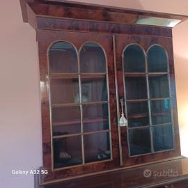 Vendo pregiata vetrina originale dell’Ottocento, in stile Impero, realizzata in legno di mogano con bellissime venature e rifiniture dell’epoca. Il mobile si compone di una parte superiore con ante vetrate e ripiani per esposizione, una ribalta centrale e due sportelli inferiori per contenimento.