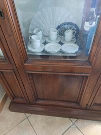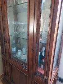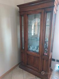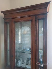 Elegante Vetrina in Legno Massiccio - Stile Arte povera Materiale e Finitura: in legno massiccio . La finitura lucida e calda aggiunge valore. Struttura: Presenta tre sezioni verticali con ampie superfici vetrate, ideali per esporre cristalli, porcellane o collezioni. Dettagli di Design: la cimasa (la parte superiore sporgente) lavorata e la base a zoccolo chiuso, che conferiscono stabilità e imponenza al mobile. Stato di Conservazione: in ottime condizioni, senza graffi evidenti o vetri Dimensioni: Altezza, Larghezza e profondità Ripiani: i ripiani interni sono in vetro (come sembrano dalla foto) Accessori: la serratura è funzionante e la chiave originale.