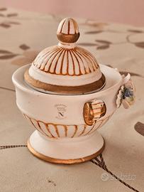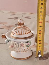 raffinato oggetto d'arte decorativa in porcellana bianca, caratterizzato da uno stile classico e romantico. Il pezzo si distingue per la meticolosa lavorazione artigianale e i dettagli ornamentali che lo rendono ideale sia come complemento d'arredo che come ricercato contenitore.