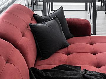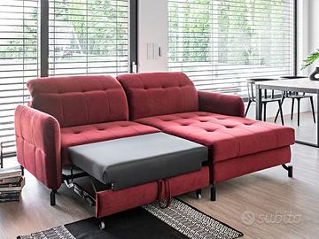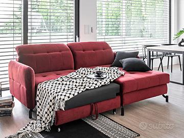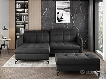 Grande novità della nuova collezione di complementi d’arredo salotti con divano letto, il divano letto angolare ad L Chamonix è composto da un divano ad angolo compatto con funzione letto ed un ampio pouf. La sua linea elegante con piedi in metallo nero si abbina perfettamente ad interni sia moderni che classici. Grazie all’utilizzo di schiuma HR altamente elastica, questo modello offre un indiscutibile comfort di utilizzo, coadiuvato anche dai poggiatesta regolabili. Le sue dimensioni ridotte, 225×160 cm, sono perfette per la collocazione in piccoli ambienti. Il divano letto Chamonix è completato da un moderno pouf con contenitore dalle dimensioni di 10×75 cm. In questo articolo è presente anche la funzione relax, che si dispiega con un movimento di una mano, trasformando il divano ad angolo in un comodo letto con una superficie di 200×110 cm. Il modello Chamonix ha un design moderno che sarà perfetto per qualsiasi interno. La disponibilità in un’ampia gamma di tessuti e colori lo rende ancora più accattivante. Il peso complessivo di questo salotto è di 126 Kg! Sottolineiamo che il rivestimento della funzione letto che fuoriesce può essere di colore diverso da quello evidenziato in foto e comunque non è in tinta ed è differente dalla combinazione di colore del divano che si sceglie.