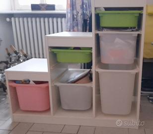 Ikea. Elementi in legno bianco con contenitori in plastica colorati (colonna cm.46X30Xh.145- gradini cm.99X43,5Xh.bassa cm.42/alta cm.94),sedia in plastica rosa e metallo,cassettiera in legno bianca con ruote (cm.35X50X h.80).
