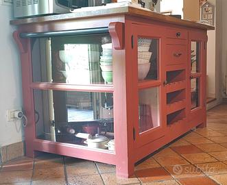 Elemento cucina in legno di abete massello con piano in rovere, maniglie e pomoli in metallo, composto da due ampi vani con ante in vetro, due cassetti e spazio sottostante per riporre orizzontalmente le bottiglie.