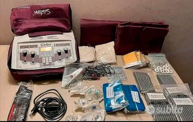 Elettrostimolatore Estetico e Medicale per il trattamento del dolore, per la parte estetica e Tonificante del corpo, marca SINTESI. Composto da apprecchio, tutine, elettrodi, cavi, 2 fasce elastiche 40 cm e 50 cm, 2 fasce elastiche 80 cm e 100 cm,custodie per accessori,manipolo.