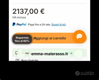Vemdo materasso TOP DI GAMMA Molle + Memory foam + altri materiali pee garantire il massimo del sostegno e della cokpdita Di listino 2.100,00 Pagato scontato 1.100,00 meno di un anno fa Praticamnte NUOVO Basta vederlo Svendo a 600,00 ma per chi lo ritira ENTRO il 10 maggio lo regalero a 400,00 Vendo per pasaggio ad altra misura della strssa linea. Non potendolo tenere in casa, Passata tale data lo imballero’ e lo portero alla casa al mare a balestrate, dovra essere ritirato li e il prezzo tornera a 650,00 non trattabili. Garantisco che e super conodo finche non lo imballo potete fare QUALSIASI PROVA