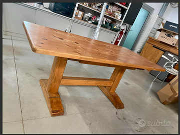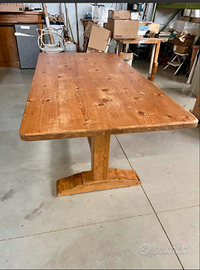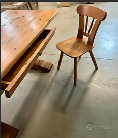 ELEGANTE e ESCLUSIVO TAVOLO "DINING TABLE" stile Seicento Ampezzano in legno massiccio di abete realizzato dai maestri artigiani Cadorini, completo di ampio cassetto e a corredo nr 6 sedie/poltroncine con 4 gambe intagliate artigianalmente in legno di pino con particolare schienale che le rende uniche: una cornice in legno con motivo a onde molto originale. CONDIZIONI ottimo stato conservativo