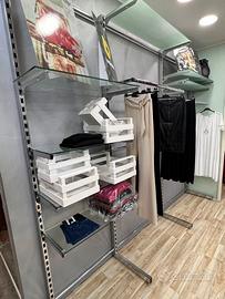 Espositore a parete adatto per negozi di abbigliamento o cabine armadio. Condizioni perfette. Componibile a piacere con la possibilità di spostare ripiani e barre a seconda delle proprie esigenze. Composizione: