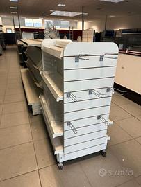Espositore bianco in metallo bilaterale con ripiani e ganci espositivi. 108x131x148 Gli espositori in plastica non sono inclusi. ZWCES005