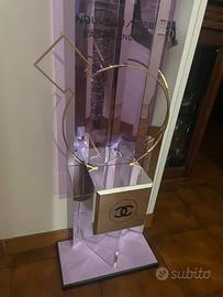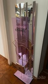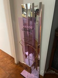 Splendido espositore pubblicitario originale Chanel Chance, ideale per collezionisti, arredatori o boutique. Espositore pubblicitario di alta gamma per punti vendita dal design molto elegante che combina pannelli a specchio, una struttura in plexiglass trasparente e una base viola. Dimensioni: 40 cm di larghezza e 140 cm di altezza. Consegna a mano su roma