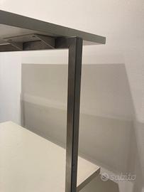 espositore da negozio in acciaio inox, dal design moderno e minimale. La struttura è composta da un telaio verticale in tubolare metallico con più ripiani orizzontali in finitura bianca, sostenuti da braccetti metallici fissati con viti. altezza 150cm larghezza 60cm