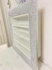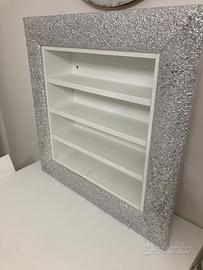 Splendido espositore a forma di cornice quadrata, con un'elegante cornice materica ricoperta di scintillanti glitter argento. Perfetto per dare un tocco glam e chic a qualsiasi stanza! Ideale per esporre smalti (ne tiene tantissimi!) • Piccole collezioni di profumi • Boccette di oli essenziali • Oggettistica e miniature Perfetta per un salone di bellezza, un angolo make-up o una camera da letto elegante. Misure 68x68cm.