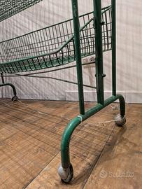 Vendo espositore vintage colore verde di metallo con ruote di una vecchia edicola per riviste e giornali.