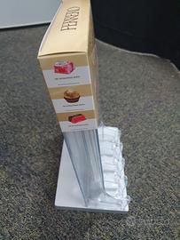 L’espositore Ferrero da banco per praline singole con scivolo permanente è un supporto compatto e funzionale, pensato per la vendita al dettaglio su bancone. Realizzato in plastica rigida, ha un design elegante con grafiche ufficiali Ferrero e colori tipici del brand.