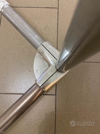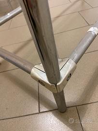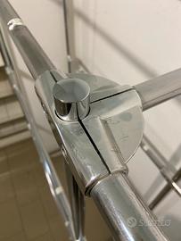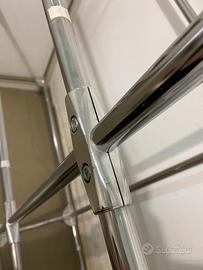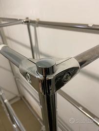 Espositore per negozi, uffici e casa, modello a giorno con quattro ripiani divisibile in due parti a lunghezza diversa (lunghezza di una parte cm.97 e l’altra cm.73), con visibilità da ambo le parti, utilizzabile anche come libreria e divisorio. Struttura e giunti metallici cromati fermati con viti e dadi a brugola. Ripiani di vetro spesso. Condizioni ottime. Misure: cm.170 (97+73)x50x h.176. Questo articolo non ha difetti, ma può presentare lievi segni di utilizzo.