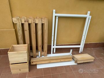 Solida base e impalcatura in metallo; fondo, ripiani e cubi in legno grezzo che possono essere disposti liberamente in base alle proprie esigenze con un semplice meccanismo ad incastro.
