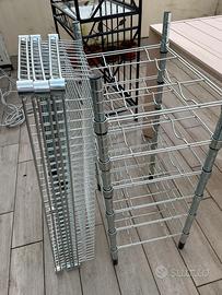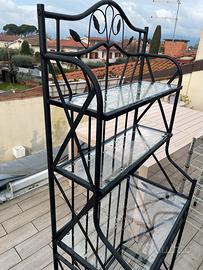 Vendo espositore in ferro con ripiani in vetro H174 L66 e P40 piu portabottiglie 24 bottiglie vino e mobile a 3 ripiani in metallo L90 H90 P36