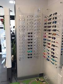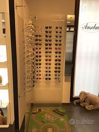 Espositore per occhiali, composto da tre file, ogni fila contiene 14 occhiali. Ha un altezza di 2 metri e una larghezza di 65 centimetri. Disponibili 3 pezzi di cui uno rovinato (come si vede nell'ultima foto)