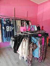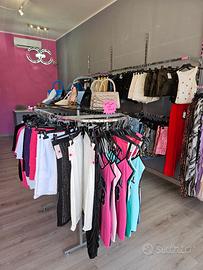 Espositore per appendere vestiti con stampelle e ripiano in vetro dove esporre accessori o sempre vestiti piegati. Regolabile in altezza e lunghezza fino a circa 1,5 mt. Vendo per cessata attività alla metà del prezzo originale, prezzo non trattabile.