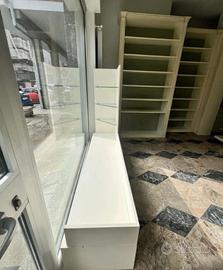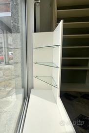 Espositore per vetrina con ripiani in vetro.