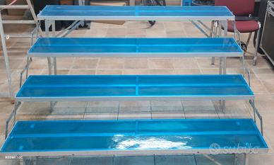 Banco in alluminio ultraleggero ed ultraresistente. Adatto all'esposizione di prodotti su più livelli. Ideale per manifestazioni, mercatini, eventi, chioschi. Piano in vetroresina .