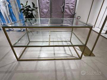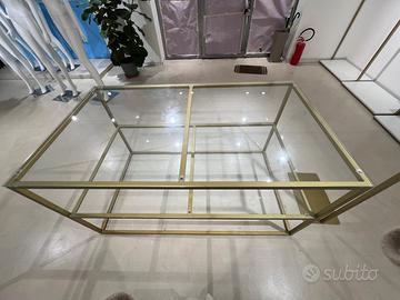 Tavolo espositore per diverse categorie: abbigliamento, accessori, pelletteria, gioielleria ed altro. Struttura in acciaio dorato sarin cin doppio piano in cristallo. Dimensione 180*100*100 cm (l*p*h) 2 pezzi