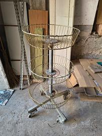 Vendo espositore artigianale dotato di ruote e con tre cestini circolari in metallo porta oggetti. Il diametro della base è 0,75 cm ed è altro 1,15 cm. Non spedisco.