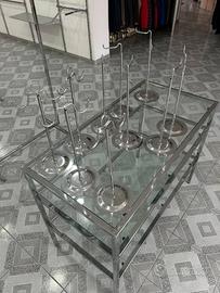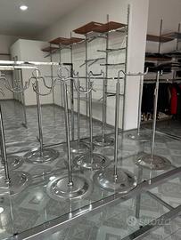 Set completo per negozio di abbigliamento completo di: 10 espositori per borse in acciaio regolabili 5eur x pz - 4 doppio braccio - 6 braccio unico 1 stender a 4 braccia appendiabiti regolabile in altezza 60eur - altezza massima 180cm - altezza minima 110cm
