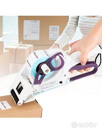Applicatore di etichette adesive e codici a barre per diverse superfici e anche per bottiglie o vasetti rotondi.