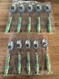 Set di posate con decoro colorato Maiolica sulle tonalita del verde. Design curato nel dettagli ed ideale sia per tavole a tema, sia per uso quotidiano. Dimensioni: 6 forchette: cm. 19; spessore mm. 1,8.6 Coltelli: cm.21,5; spessore mm. 1,8. 6 Cucchiai: Cm. 19; spessore mm.1,8. 6 Cucchiaini caffè: Cm. 14; spessore mm. 1,8. Materiale: acciaio inox AISI 430, Manicatura ergonomica in poliestere caricato vetro. Il decoro "Maiolica Green" si ispira al verde acceso del Lime: piccolo agrume che sprigiona sapori e profumi mediterranei, capace di far risaltare le prelibatezze sulla tua tavola. Lavabile in lavastoviglie.