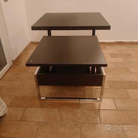 Raro oggetto di design e funzionalità che trasforma un tavolo da salotto ( o da fumo ) ( 90x90 H 42 ) in un comodo e robusto vero tavolo da 2/3 persone ( 90x90 H 77 ) con tavolino d'appoggio ( 65x60 ) oppure da 6/8 nella generosa misura di 180x90. Altra chicca di quest'oggetto è un comodo vado sotto il piano di appoggio utilissimo per riporre tovaglie, tessuti od altro. Materiale melaminico, Condizioni perfette! Firmato F&F