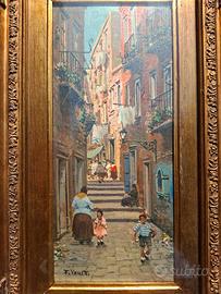 Vendo dipinto originale di Francesco Vassetti, olio su tavoletta raffigurante tipico vicolo napoletano con figure.