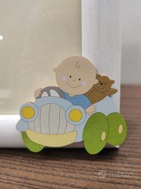 Cornice in legno da parere Fabula con 2 applicativi in legno, farfalla e bambino nella macchina