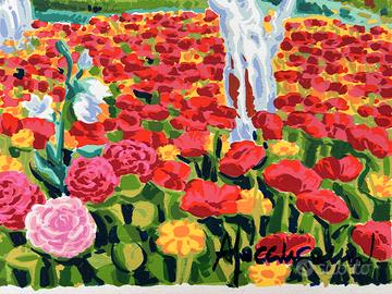 Faccincani Athos - Il canto degli ulivi tra rose e sole alto, Serigrafia polimaterica a 36 passaggi di colore cm.50x100, esemplare Bon a Tirer.