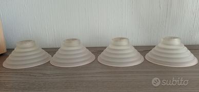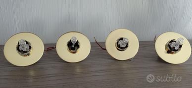 N. 4 Faretti a cono in vetro acido bianco latte con leggere sfumature in rosa cipria. Supporto in metallo dorato come da foto allegate. I faretti sono completi di lampade alogene a 24 volt 50 watt ed importante trasformatore 220/24 volt. I faretti sono in condizione ottimale senza crepe e scheggiature. Dimensioni: Altezza 10 cm. diametro 12 cm. Vengono montati su un foro diametro 4,5 cm. Il prezzo s'intende impianto completo.