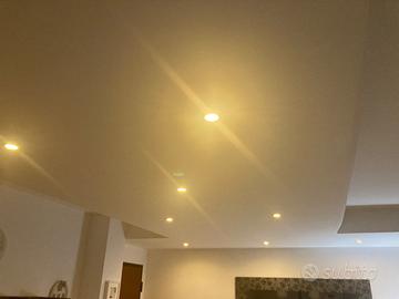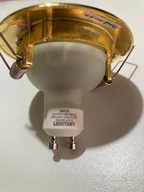 Vendo portafaretti dorati con faretto a led 220 V e portalampada incluso; faretti attaco Gu10 con illuminazione luca calda da 2,7 W, perfettamente funzionanti; li sostituisco per passaggio ad un altro modello. Prezzo 4,5 euro cadauno ( portafaretto, faretto e portalampada). Totale qty 7