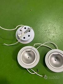 3 faretti da soffitto, buono stato, colore bianco 12 volt, interno cm 6,5 esterno cm 7,5 prof 2,5 cm (le lampadine non le ho). Incluso trasformatore 220/12 V