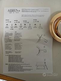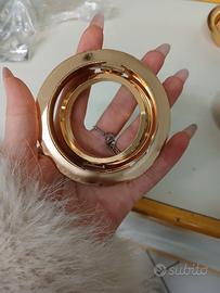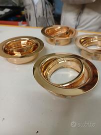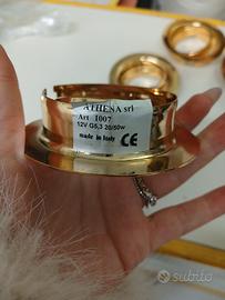 4 faretti color oro fatti in metallo confezionati uno a uno impacchettato con scatola ufficiale e istruzioni ci sono anche i loro fissatori su cartongesso diametro foro= 6.65 diametro foro esterno =90 vendita a fine magazzino, mai stati usati