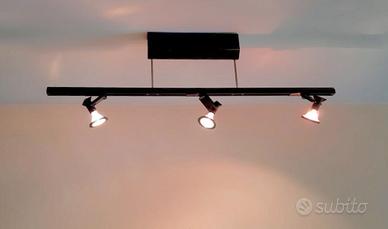 Vendo sistema di illuminazione a binario con 3 faretti orientabili, ideale per valorizzare ingresso, quadri, stampe o altri oggetti. Colore nero, esteticamente pulito, adatto a spazi piccoli e medi o per illuminazione d'accento.